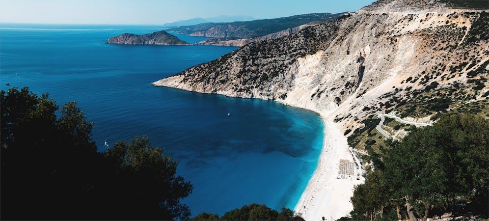 No photo guide to Kefalonia would be complete without Myrtos Beach. The panoramic viewpoint from above is legendary: white pebbles, electric-blue water, and towering limestone cliffs create one of the most photographed scenes in Greece.